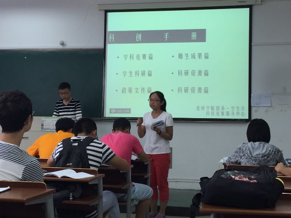 会议伊始,凌同学向各班科协委员介绍了科竞中心的作用以及何谓科协委员。在此之后详细讲解了学生科技创新指导手册的内容。其中侧重讲解了“挑战杯”等各类竞赛和学生科研活动。随后又介绍了化材学院近几年的科研成果。最后,凌同学强调了学院以及科竞中心对于科协委员的重视,并表示科竞中心欢迎各位科协委员对中心的工作提出自己的建议或意见。