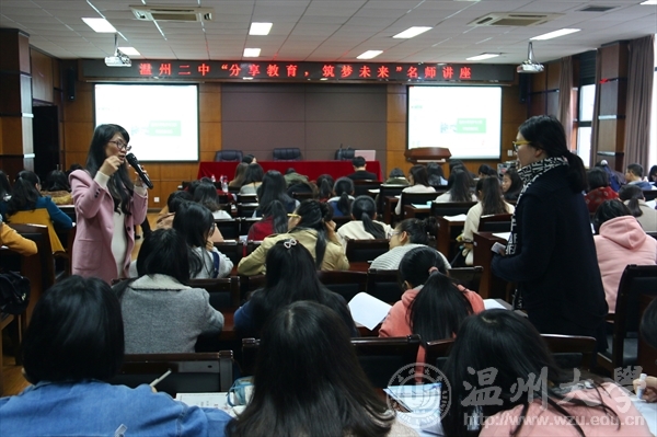 随后,温州二中教授级物理老师余雪妹在讲座中为大家分享了如何打造一堂魅力班会课的要领。余老师的分享极具有创造性,通过生动的例子,直接和我们展现有趣的班会创意点,如:名校之旅,集体生日,感动中国——班级之最,中国达人秀和巧借家长等。余老师认为,一切从学生出发,学生怎么开心怎么做,紧跟潮流,正确引导学生全员参与,这样的班会课才会真正使学生自信与成长。余老师的分享让同学们感受到班会课也可以这样有趣,打造一堂魅力班会课对班级至关重要。
