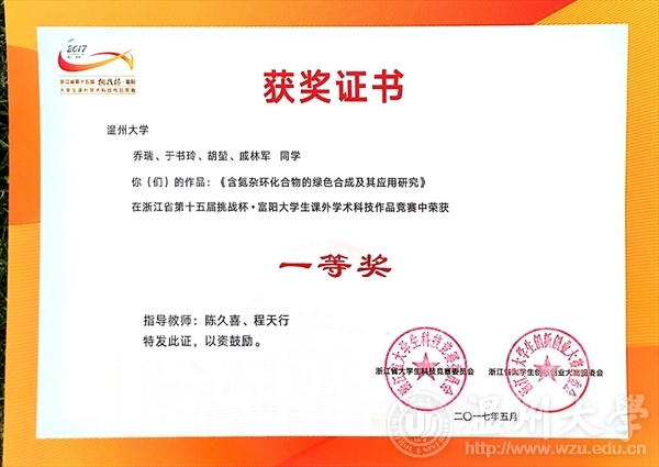 乔瑞、于书玲、胡堃、戚林军同学的作品《含氮杂环化合物的绿色合成及其应用研究》(指导教师:陈久喜、程天行)荣获决赛一等奖,调教视频