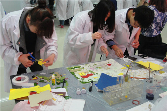“春风拂面,魅力鸢都姹紫嫣红。大地复苏,民间画手泼墨挥毫 ”。随着主持人的一声令下,所有参赛选手立刻投入到紧张的比拼之中。比赛现场,选手们摆开阵势,带着信心,在画纸上用我们五颜六色的化学试剂尽情挥洒,或凝笔沉墨,或细心勾勒,或精描细抹。舞蹈的少女、远离雾霾的城市......一幅幅构思新颖、色彩奇异的作品跃然纸上,无不凝聚着大家对美好生活与梦想世界的纯真渴望。除了试剂上色外,他们还运用树叶、蛋壳、砂子等辅助材料使作品独具一格。