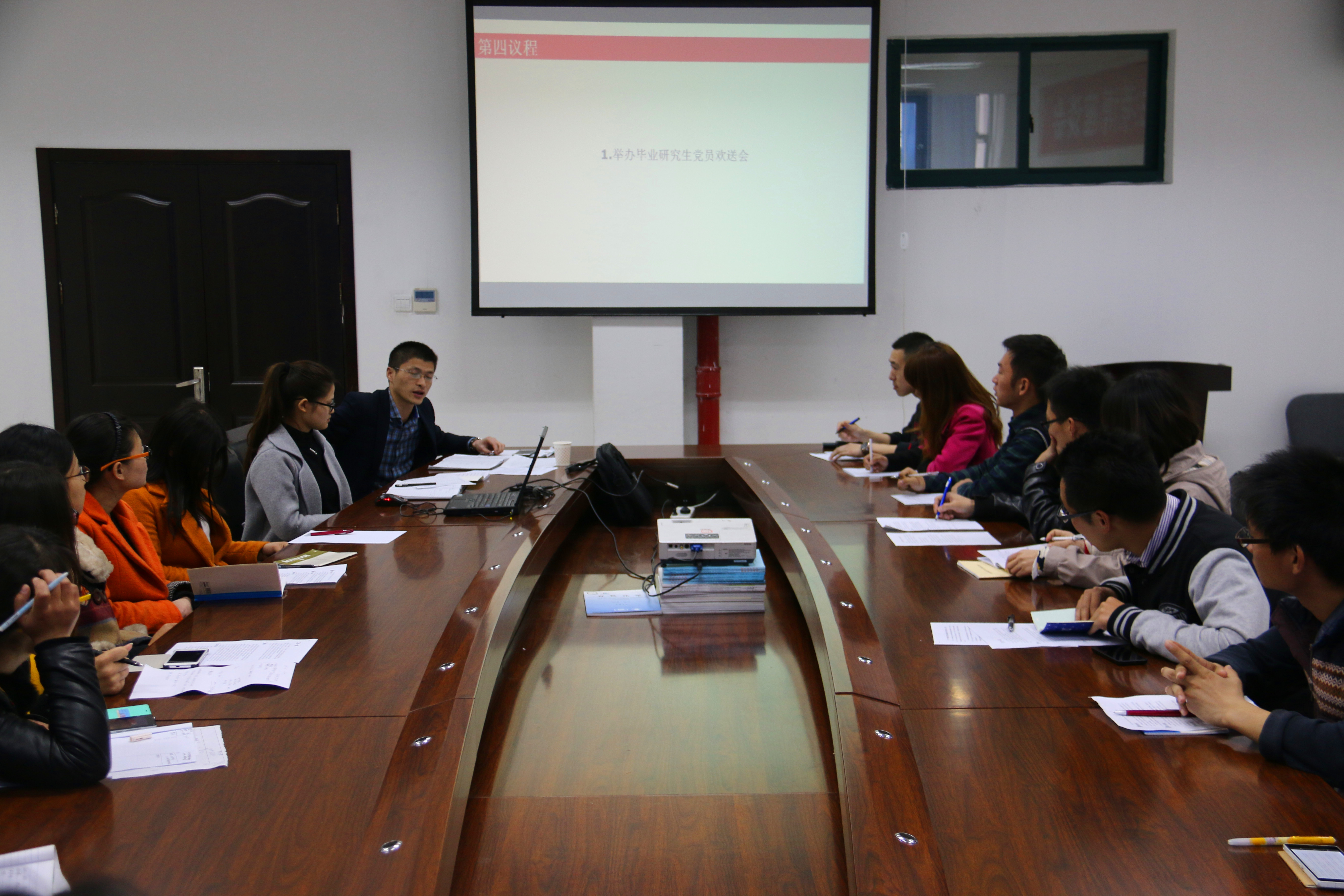 于11B-204举办了新学期第一次研究生党员党务工作会议暨教育活动布置大会,参与会议的有学生科科长王壮老师和研究生学生支部委员。