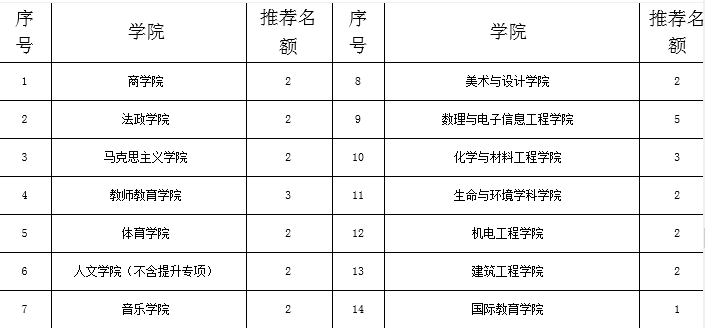 学院根据学科梯队建设的需要,对申请人员进行推荐,各学院推荐脱产进修名额如下,学院对同一系列申报教师进行排序推荐。